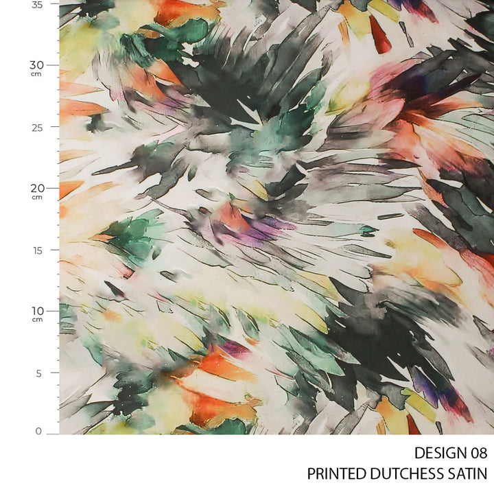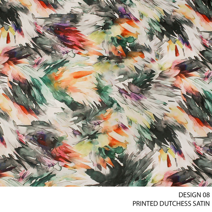 Printed Duchess Satin is a luxurious, medium- to heavyweight fabric known for its smooth, glossy surface and elegant drape. Featuring vibrant and detailed prints, this fabric combines the richness of satin with bold designs that stand out beautifully.