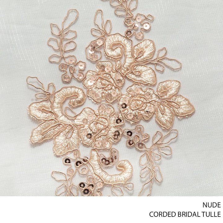 Corded Bridal Tulle is a delicate, sheer fabric that combines the light and airy quality of fine tulle with the elegance of corded embroidery. The fabric is further enhanced with sequins, adding a subtle sparkle and a luxurious finish. Its intricate design, raised corded details, and soft drape make it a popular choice for high-end bridal wear, formal gowns, and special occasion dresses.