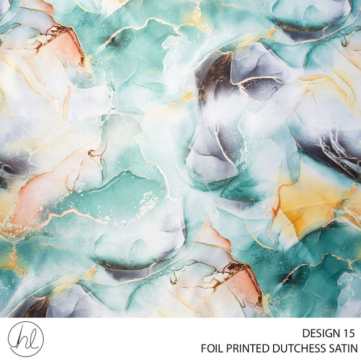 Foil Printed Duchess Satin is a luxurious, medium to heavy-weight fabric with a smooth satin finish that features a metallic foil print design. The fabric has a structured body with a subtle sheen, making it both elegant and eye-catching. The foil printing technique adds a decorative, reflective effect that enhances the richness of the fabric.