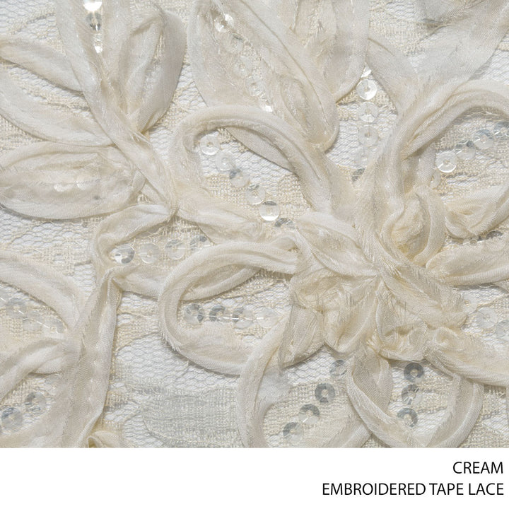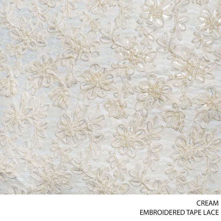 Descriprion: Embroidered Tape Lace is a decorative lace fabric created by stitching embroidered patterns onto a tape-like base. The tape, often made from cotton or polyester, is shaped into intricate designs such as flowers, scrolls, or geometric motifs, which are then joined with fine stitches or mesh to form the lace.