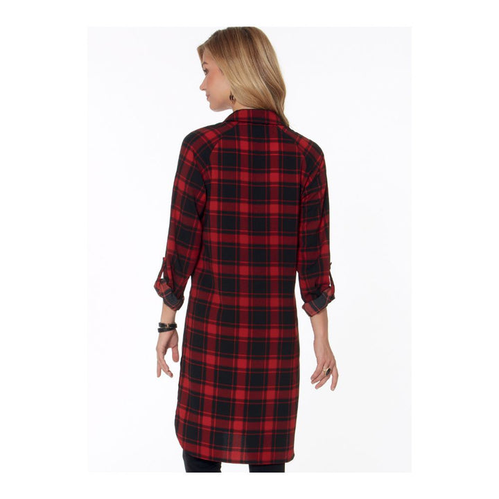Loose-fitting button front shirts and tunics have raglan sleeve, hem, and collar variations. A, F: Sleeve tabs. A, C, D, F: Chest pockets. C, D, E, F: Button cuffs. D: Wrong side of fabric will show. E: Self-belt. B: Stand-up collar. A, C, D, E, F: Pointed collar.