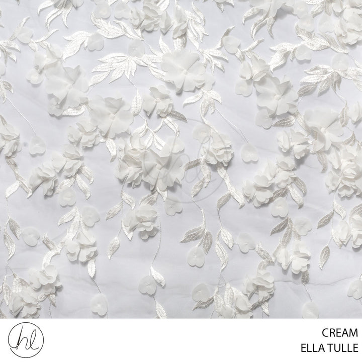 Ella Tulle is a delicate, sheer mesh fabric that features intricate embroidery combined with individually sewn-on 3D floral appliqués. The tulle base gives it a lightweight and airy feel, while the embroidered details and dimensional flowers add texture and elegance. This fabric is often used in high-end fashion, evening wear, bridal gowns, and special occasion outfits where a romantic and ethereal look is desired.