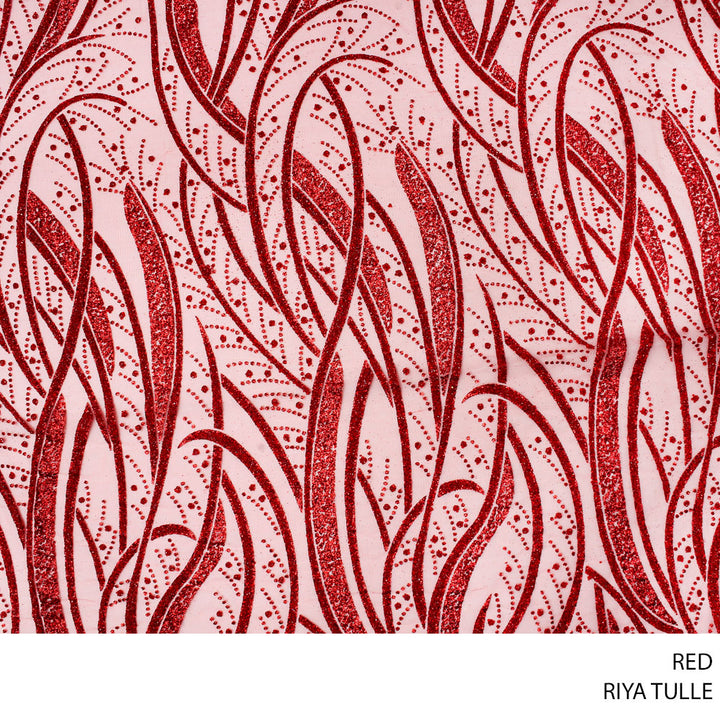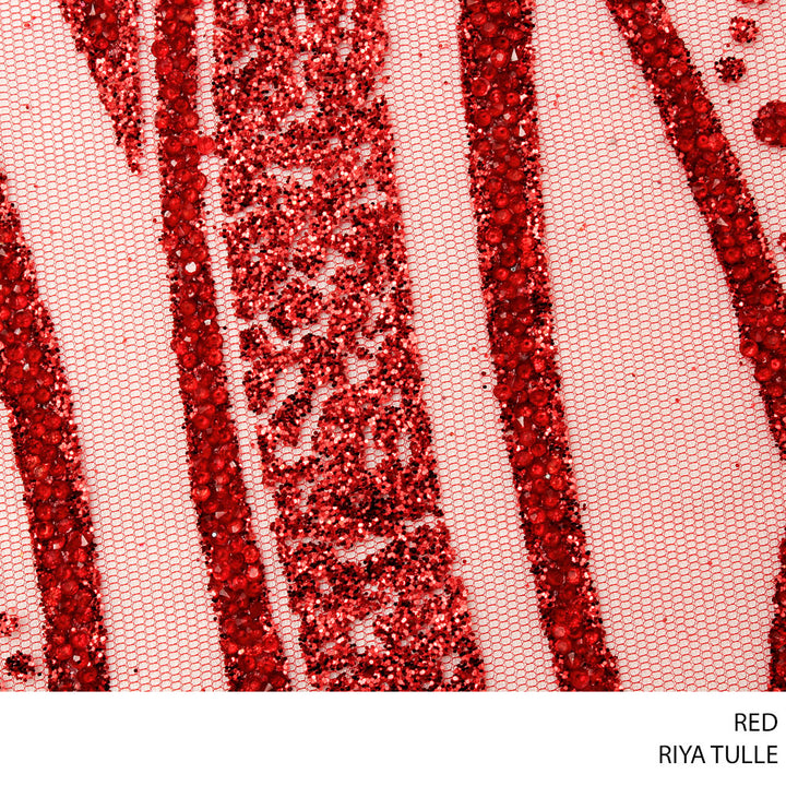 Riya Tulle is a lightweight, sheer net fabric with a fine mesh weave, designed to add elegance and sparkle. It comes decorated with glitter and rhinestones that are glued onto the surface, giving it a glamorous, shimmering effect. The fabric has a soft yet structured drape, making it ideal for eye-catching designs.