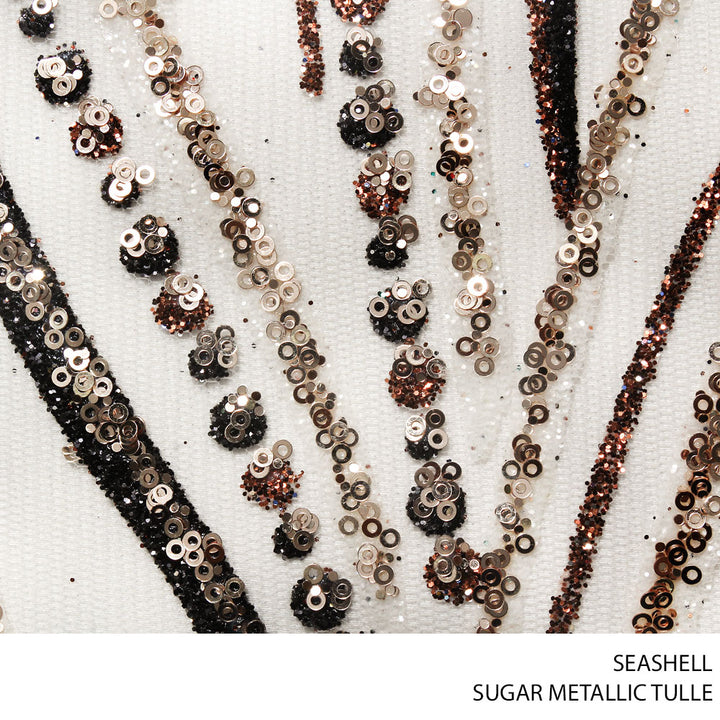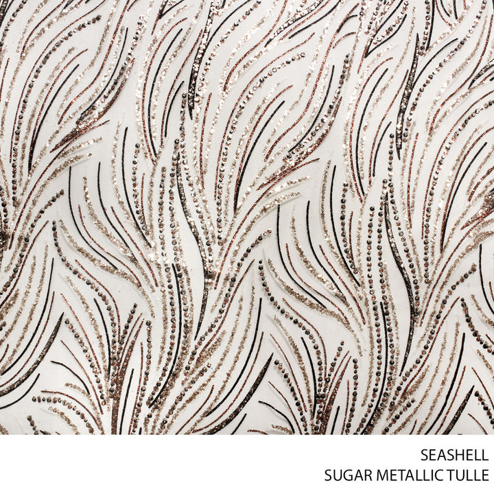 Description: Metallic Sugar Tulle is a luxurious bridal lace tulle delicately embellished with fine glitter and sequins pasted onto the surface. This fabric offers a structured, radiant finish, combining sparkle with elegance—perfect for brides seeking a glamorous touch. The glittered and sequined detailing adds depth and shimmer, making it ideal for eye-catching, yet refined, wedding designs.