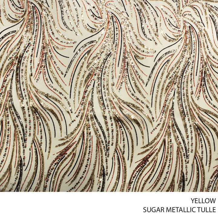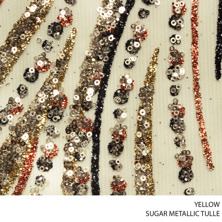 Description: Metallic Sugar Tulle is a luxurious bridal lace tulle delicately embellished with fine glitter and sequins pasted onto the surface. This fabric offers a structured, radiant finish, combining sparkle with elegance—perfect for brides seeking a glamorous touch. The glittered and sequined detailing adds depth and shimmer, making it ideal for eye-catching, yet refined, wedding designs.