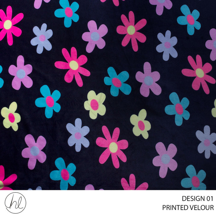 Printed Velour is a plush, soft fabric with a velvet-like surface that features printed patterns or designs. It has a luxurious sheen and a slightly stretchy quality due to its knit base. The fabric's short, dense pile gives it a rich texture and visual depth, enhancing the vibrancy of printed motifs.